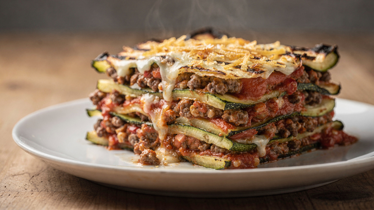 Se você quer uma refeição completa, com cara de prato caprichado e mais leve que a versão tradicional, a lasanha de abobrinha com carne moída é uma ótima escolha. Ela combina molho de carne bem encorpado, abobrinha grelhada e bastante queijo derretido, entregando um resultado suculento e firme, sem ficar aguado.