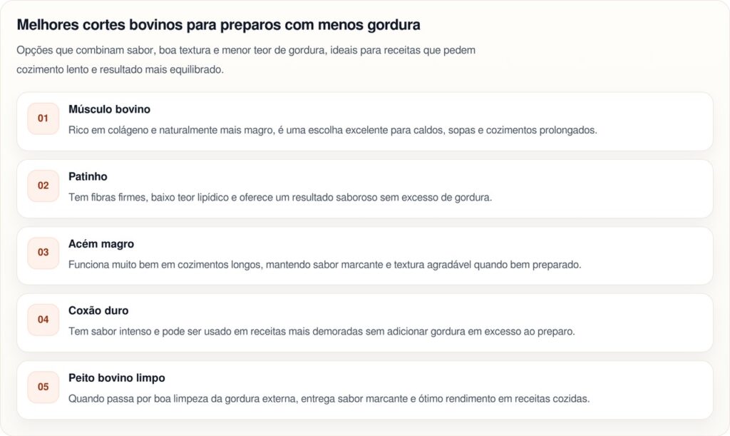 Optar por um corte de carne magro garante maior controle do teor de gordura, mantendo o equilíbrio sensorial do prato. Na gastronomia saudável, essa escolha permite preparar sopas aromáticas, nutritivas e com textura leve, preservando o sabor natural dos ingredientes.
