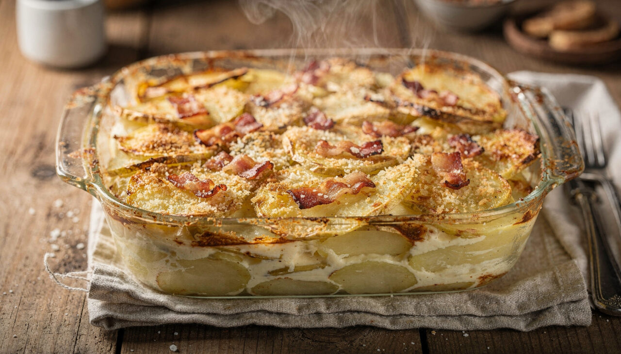 A batata gratinada com bacon e parmesão aparece com frequência em mesas de família justamente por unir praticidade e um sabor marcante. Trata-se de um preparo à base de batatas em rodelas, cobertas por um creme suave e finalizadas com queijo gratinado e bacon crocante, que pode acompanhar diferentes tipos de carne ou ser servido sozinho.