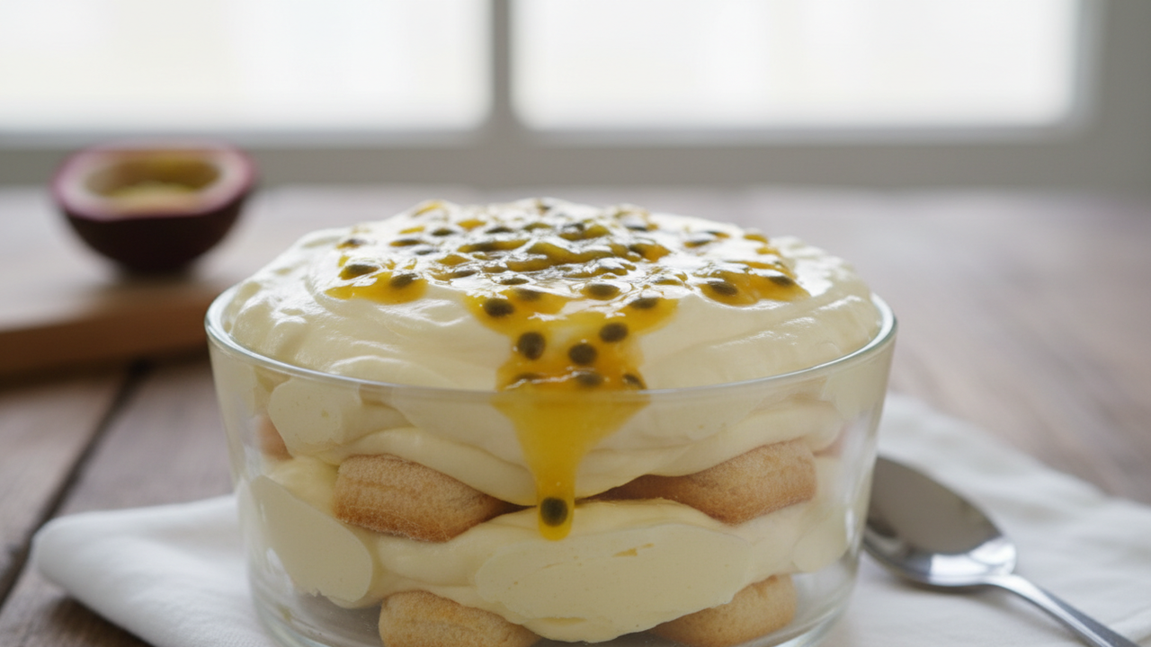 Receita fácil de pavê de maracujá com mousse e cobertura azedinha e deliciosa