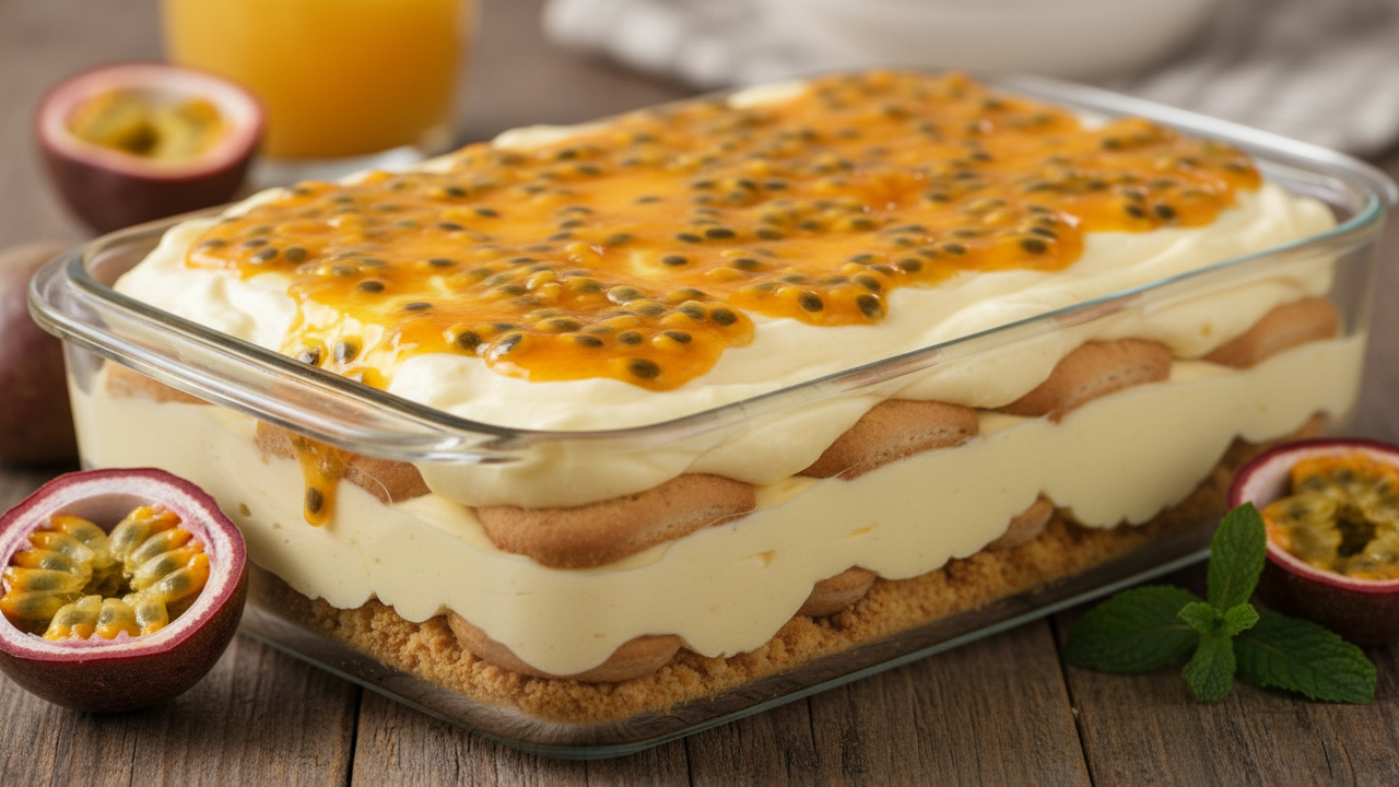 Receita fácil de pavê de maracujá com mousse extremamente cremoso e cobertura especial