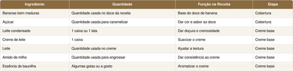 A tabela organiza os ingredientes usados nas duas etapas da receita e ajuda a visualizar melhor a função de cada item. Dessa forma, o preparo fica mais fácil e o resultado tende a sair mais equilibrado.