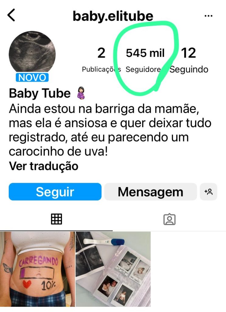 Viih Tube e Eliezer mal anunciaram que estão grávidos e o bebê do casal já ganhou uma rede social. Com o nome Baby Tube, o Instagram já acumula mais de 500 mil seguidores. Na descrição, a entrega de que o perfil foi criado pela influenciadora: “Ainda estou na barriga da mamãe, mas ela é ansiosa e quer deixar tudo registrado, até eu parecendo um carocinho de uva”.