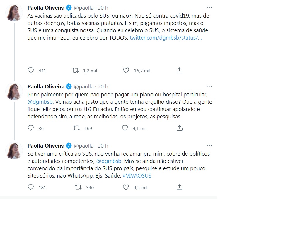 Paolla Oliveira não gostou de um comentário feito na publicação em que comemora sua vacinação contra a covid-19 com a hashtag #VivaOSUS. A atriz de 39 anos compartilhou as fotos do momento em que recebeu a primeira dose do imunizante e um usuário do Twitter foi lá e fez o seguinte comentário:
