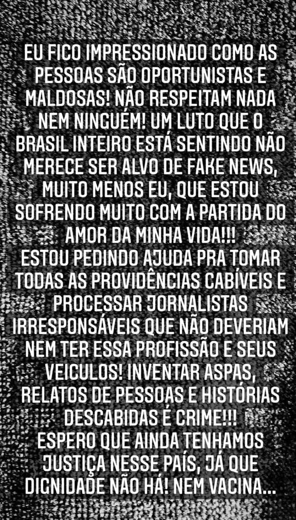 Thales Bretas, viúvo de Paulo Gustavo, usou as redes sociais para desabafar sobre os boatos de que estaria em um novo relacionamento. Neste domingo (22), o médico disse que está revoltado com a fake news, pois está sofrendo o luto da perda precoce do marido, que morreu por causa das complicações da Covid-19. “Eu fico impressionado como as pessoas são oportunistas e maldosas! Não respeitam nada nem ninguém! Um luto que o Brasil inteiro está sentindo não merece ser alvo de fake news, muito menos eu, que estou sofrendo muito com a partida do amor da minha vida. Estou pedindo ajuda para tomar medidas cabíveis e processar jornalistas irresponsáveis que não deveriam nem ter essa profissão e seus veículos! Inventar aspas, relatos de pessoas e histórias descabidas é crime! Espero que ainda tenhamos justiça nesse país, já que dignidade não há! Nem vacina…”, se manifestou o médico nos stories do seu perfil oficial no Instagram.
