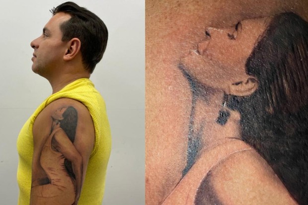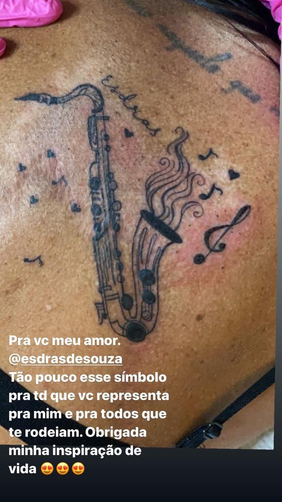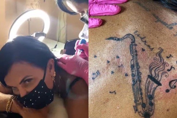 A Rainha dos Memes tatuou um saxofone nas costas com o nome do marido. Vale lembrar que Gretchen também já ganhou uma declaração de amor especial do músico, em comemoração a um mês de casamento. O saxofonista decidiu tatuar uma imagem da cantora no braço e o desenho demorou quase sete horas para ficar pronto.
