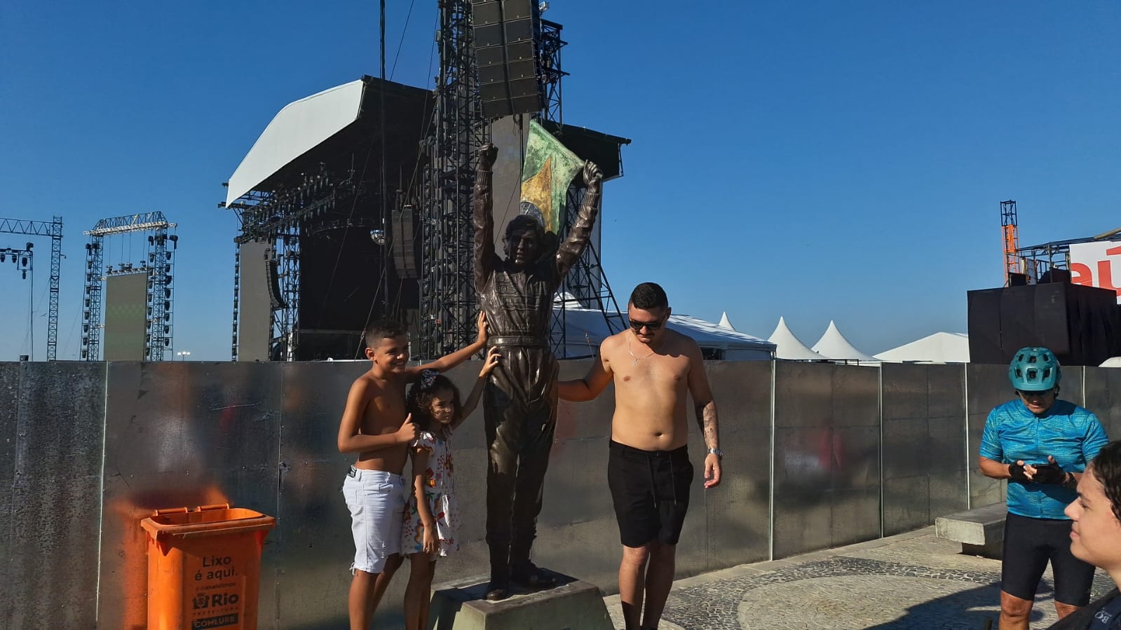 Fãs tiram fotos e relembram momentos em frente a estátua de Senna, na Avenida Atlântica, em Copacabana