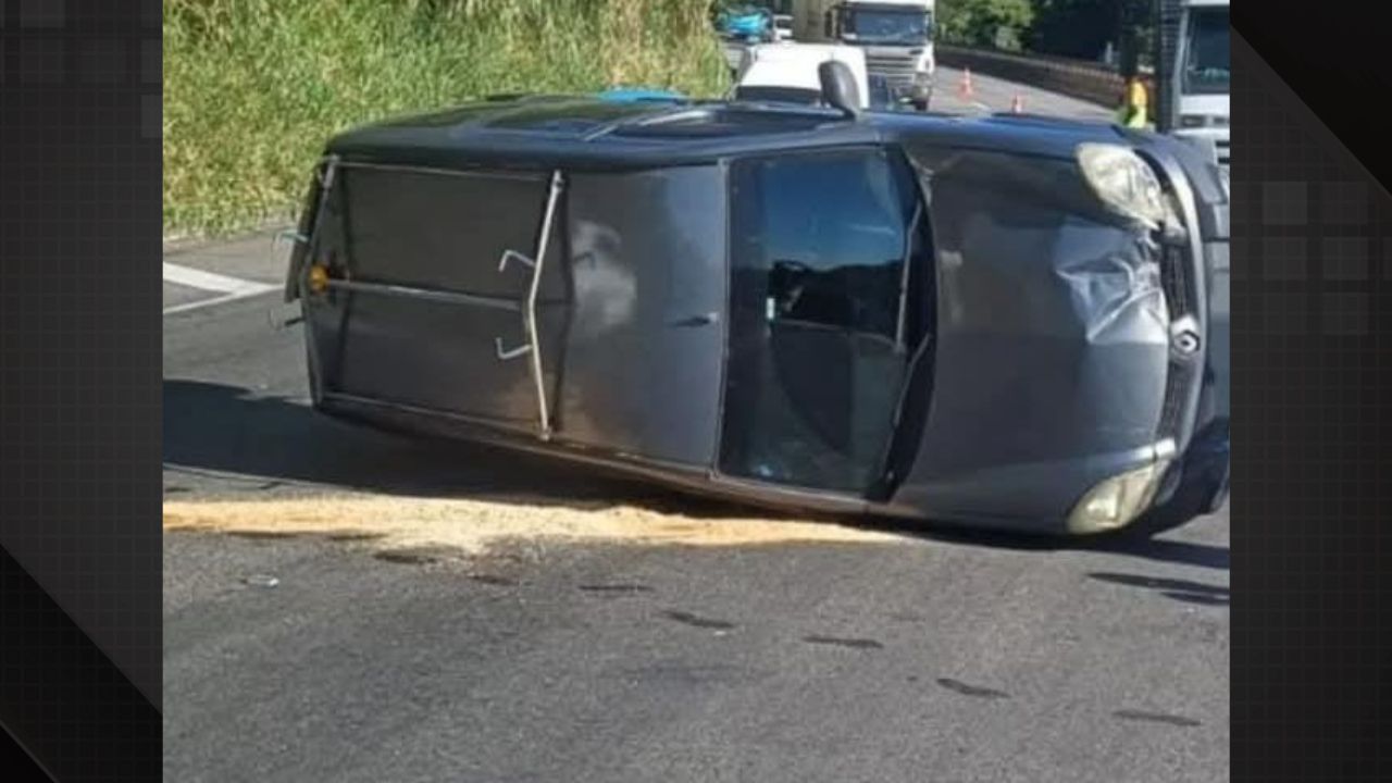 Um caminhão de pequeno porte, no final da fila, não conseguiu frear a tempo e bateu na traseira de um automóvel. Com o impacto, o carro foi projetado à frente, colidindo com outro caminhão antes de tombar e ficar atravessado na pista.