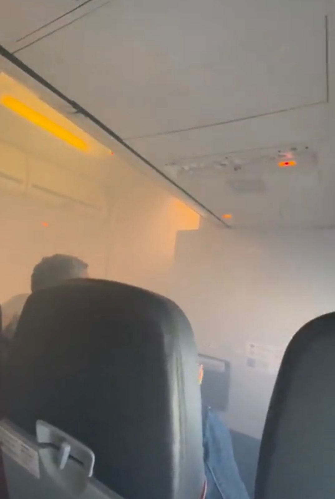 Um vídeo compartilhado nas redes sociais mostra a fumaça dentro do avião e os passageiros cobrindo o nariz e a boca com as roupas.