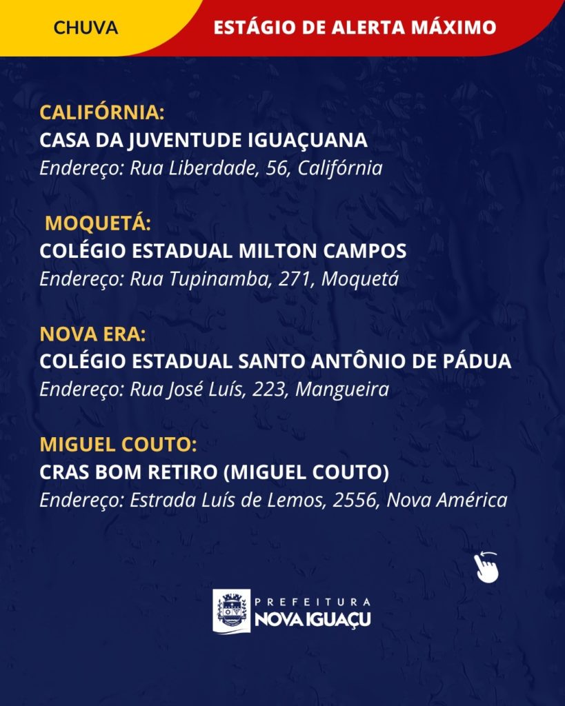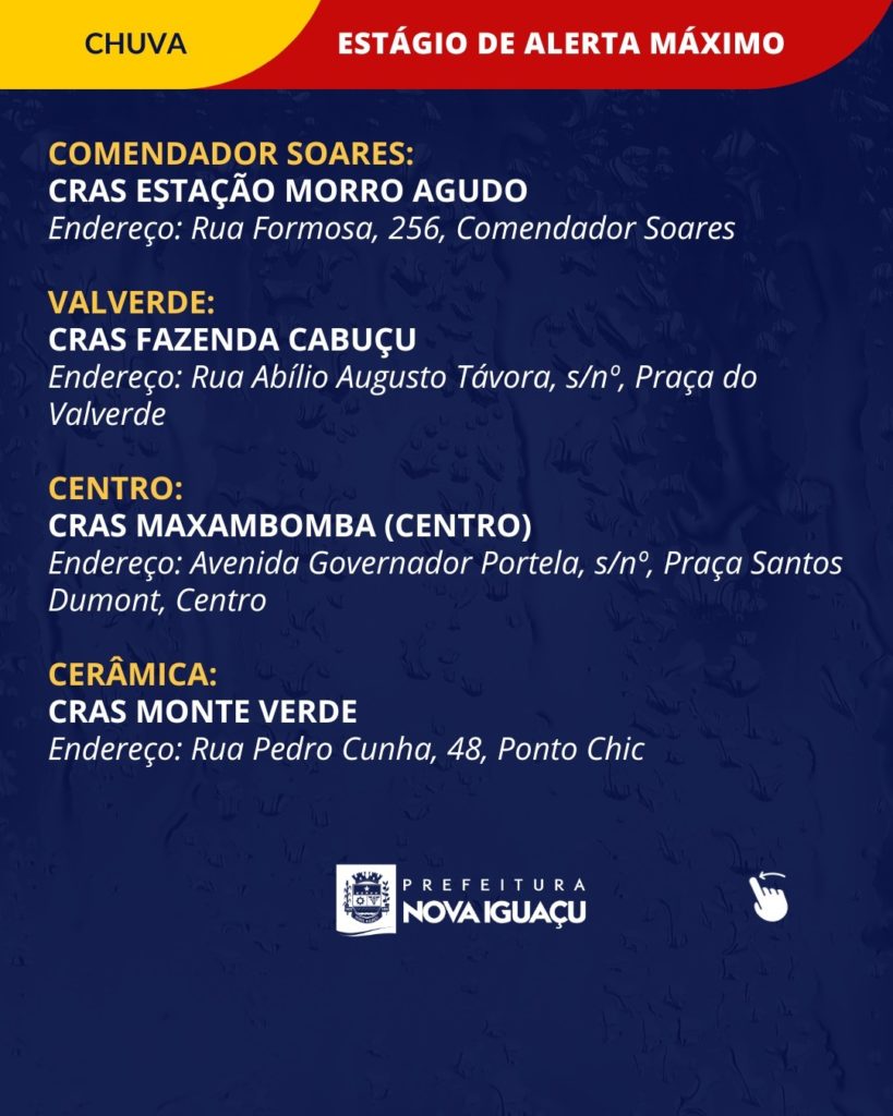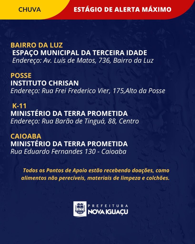 Confira abaixo a lista completa com os 12 pontos de apoio montados pela Prefeitura de Nova Iguaçu para os moradores afetados pelas fortes chuvas: