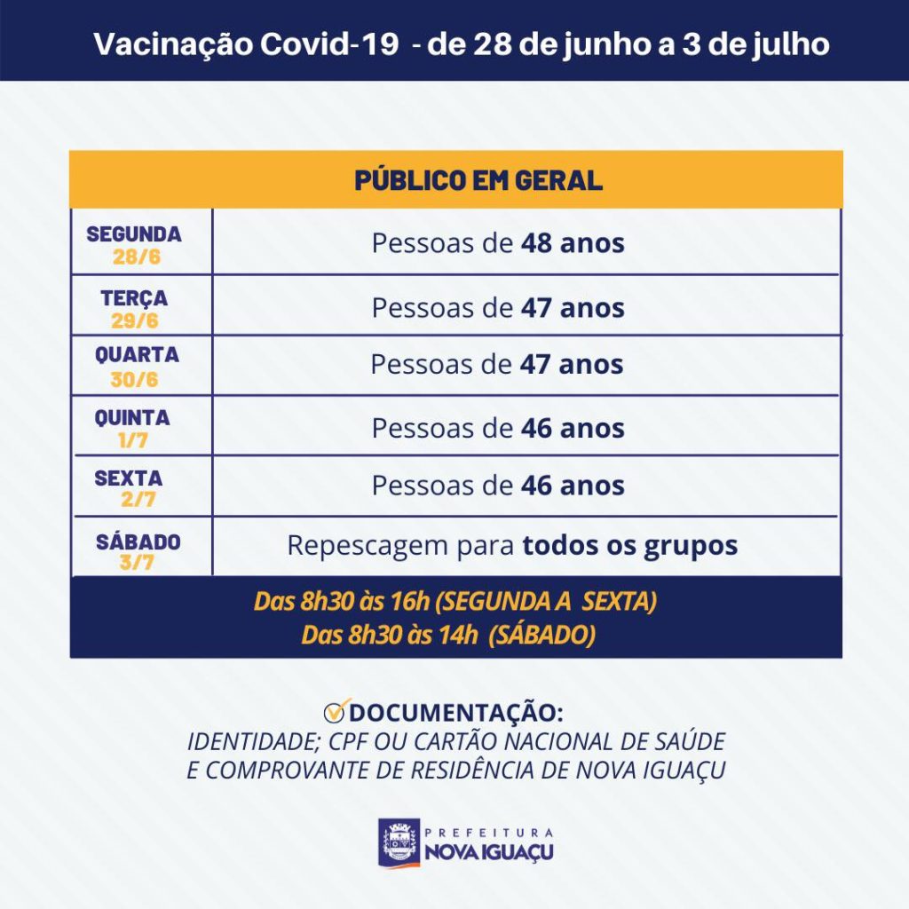 Entre segunda(28) e sexta-feira(2), a Prefeitura de Nova Iguaçu informou que vai imunizar pessoas entre 46 e 48 anos. Amanhã(28), será a a vez dos iguaçuanos com 48 anos. No sábado haverá repescagem para todos os grupos que perderam a vacinação. Os 24 pontos de vacinação estarão atendendo das 8h30 às 16h durante a semana, e até as 14h no sábado.