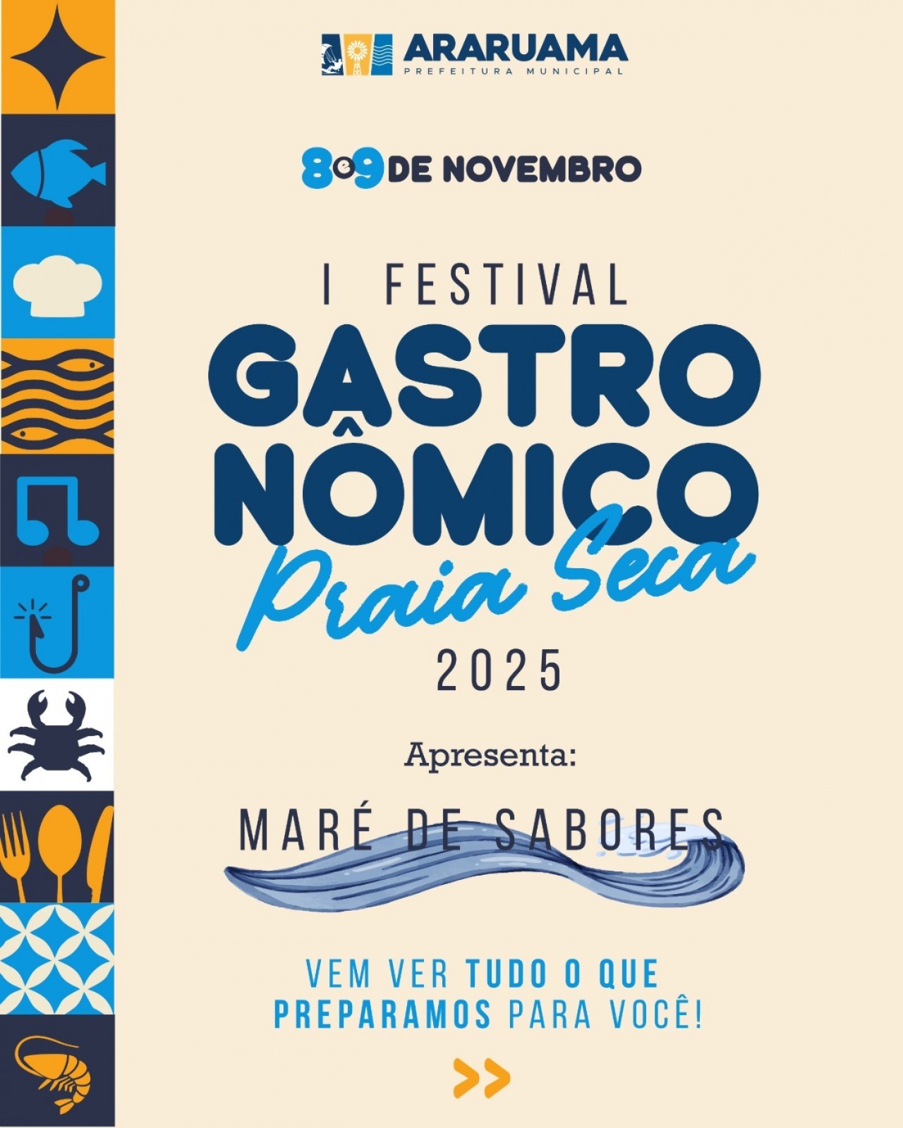 Araruama entra de vez no calendário gastronômico da Região dos Lagos. Neste fim de semana. Neste sábado e domingo de novembro, a prefeitura realiza o 1º Festival Gastronômico “Maré de Sabores”, no Calçadão de Praia Seca, com entrada gratuita e programação a partir das 12h. O evento reunirá restaurantes e chefs da cidade, que irão apresentar criações inspiradas na Lagoa de Araruama, a maior laguna hipersalina do mundo.