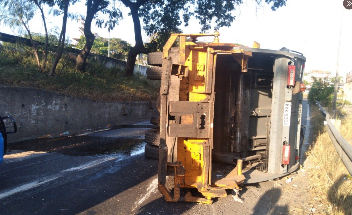 Caminhão de lixo tomba na Linha Amarela e causa transtornos para os motoristas