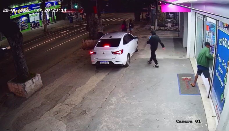 Imagens de câmeras de segurança flagraram toda a ação dos criminosos, que chegaram ao local em um carro branco rendendo todos que estavam no estabelecimento comercial.