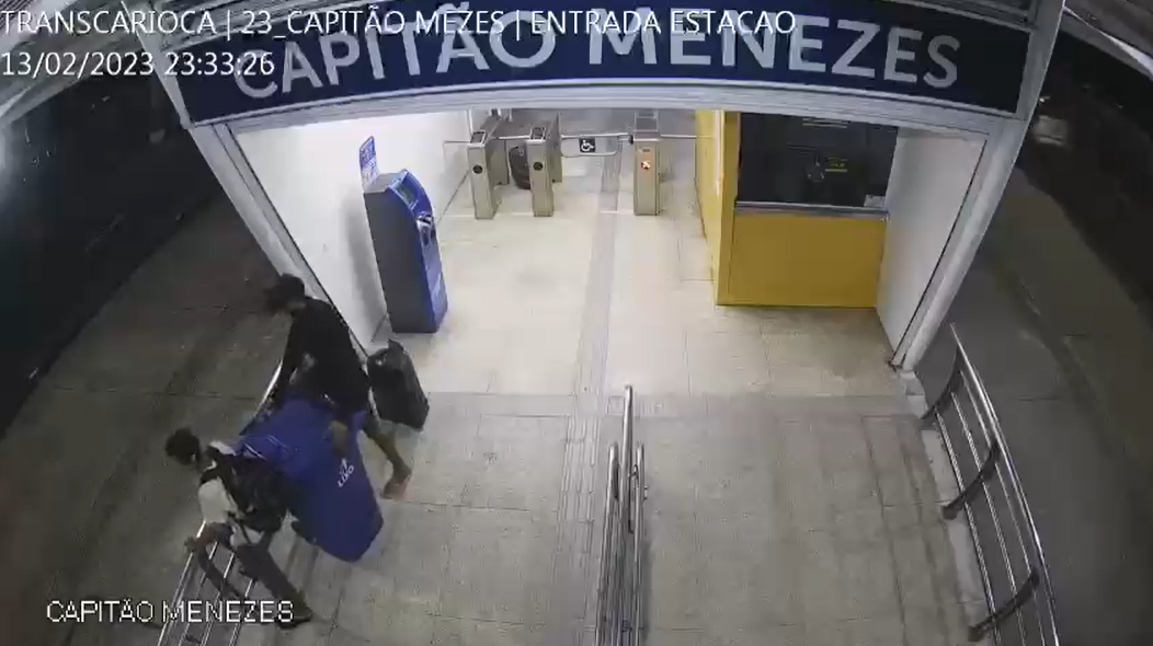 Dois homens foram presos em flagrante nesta terça-feira (14) após furtarem uma lixeira da estação de BRT Capitão Menezes, do corredor Transcarioca, na Praça Seca, Zona Oeste do Rio. O crime foi flagrado pelas câmeras de segurança da estação.