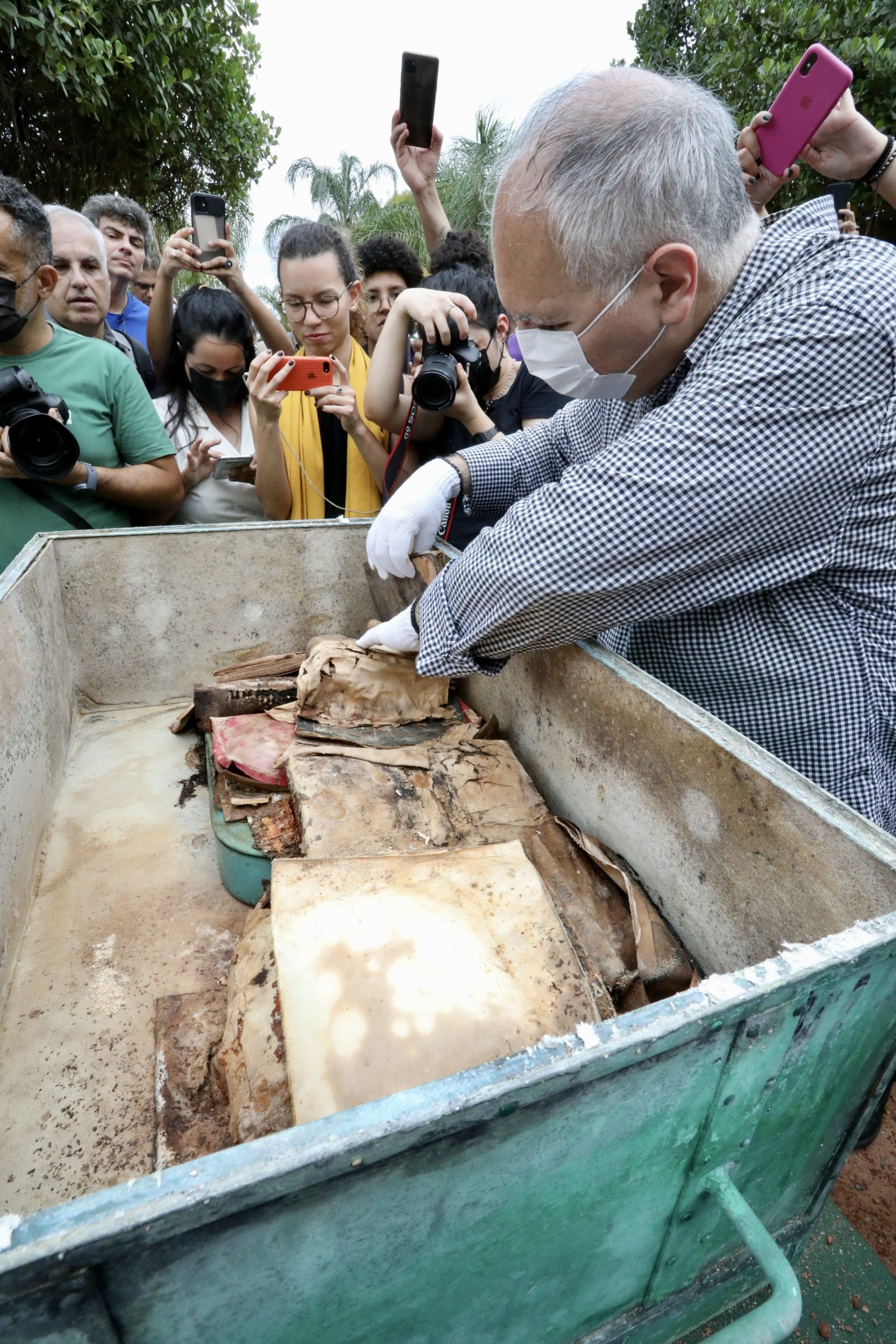 O historiador André Chevitarese ajuda a retirar o conteúdo da cápsula do tempo que havia sido enterrada nos 150 anos da Independência do Brasil (Foto: Beth Santos/Prefeitura do Rio)