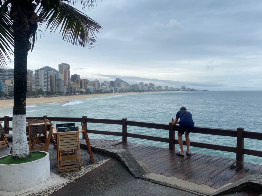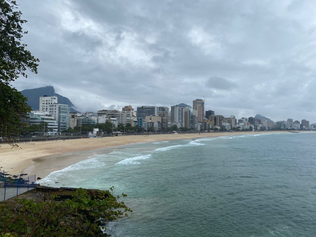 Apesar do clima mais frio e da chuva que atinge não só a Zona Sul do Rio, cariocas aproveitam para praticar atividade física ao ar livre e alguns até se arriscam em dar um mergulho. Turistas são vistos pela orla tirando fotos, como no Mirante do Leblon.