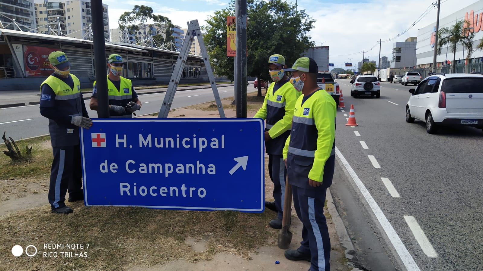 Profissionais da CET-Rio concluíram nesta terça-feira (28) o serviço de sinalização vertical – colocação de 36 placas de orientação – para acesso rápido ao Hospital Municipal de Campanha que será inaugurado no RioCentro, em Jacarepaguá. De acordo com a Prefeitura do Rio também foram realizados pintura e reforço na sinalização do asfalto já existente das principais vias nas proximidades do hospital. A operação havia começado no dia 20 de abril.