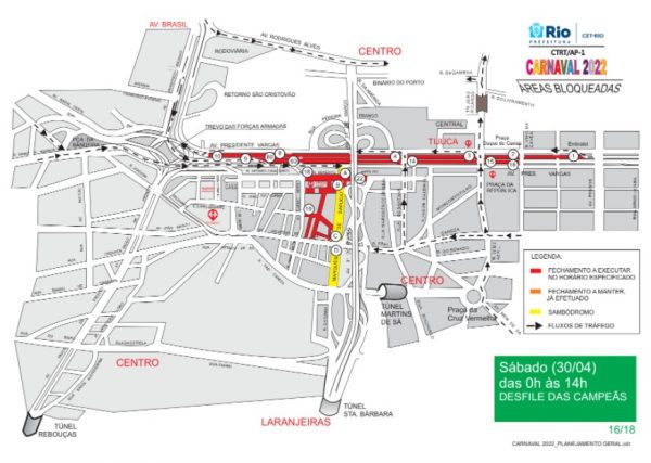 A CET-Rio montou esquema especial de trânsito no Centro da cidade e em todos os seus acessos por conta do Desfile das Campeãs do Carnaval 2022, neste sábado (30/4), no Sambódromo. A operação contará com a participação de 260 operadores de trânsito, entre agentes da Guarda Municipal, da CET-Rio e apoiadores de tráfego, que trabalharão para manter a fluidez, coibir o estacionamento irregular, ordenar os cruzamentos, orientar pedestres e efetuar os bloqueios viários necessários.