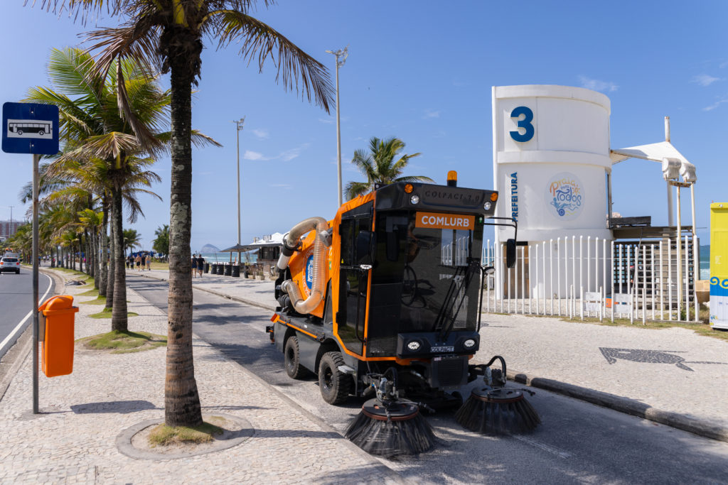 As duas varredeiras mecânicas compactas, apresentadas pela Comlurb durante a primeira semana de shows do Rock in Rio, iniciaram a limpeza em algumas ruas da Barra da Tijuca esta semana, incluindo a ciclovia da Avenida Lúcio Costa.