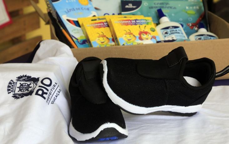 Entre os materiais do Kit escolar, estão: Um par de tênis, apontador, borracha, caderno de desenho, caneta e cola.