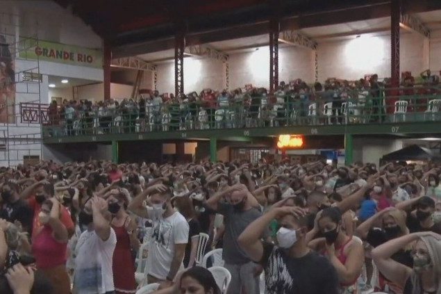 Quadra da Grande Rio foi cedida para um culto da Igreja Pentecostal Templo dos Milagres. Nas imagens é possível identificar algumas pessoas sem máscara próximas uma das outra