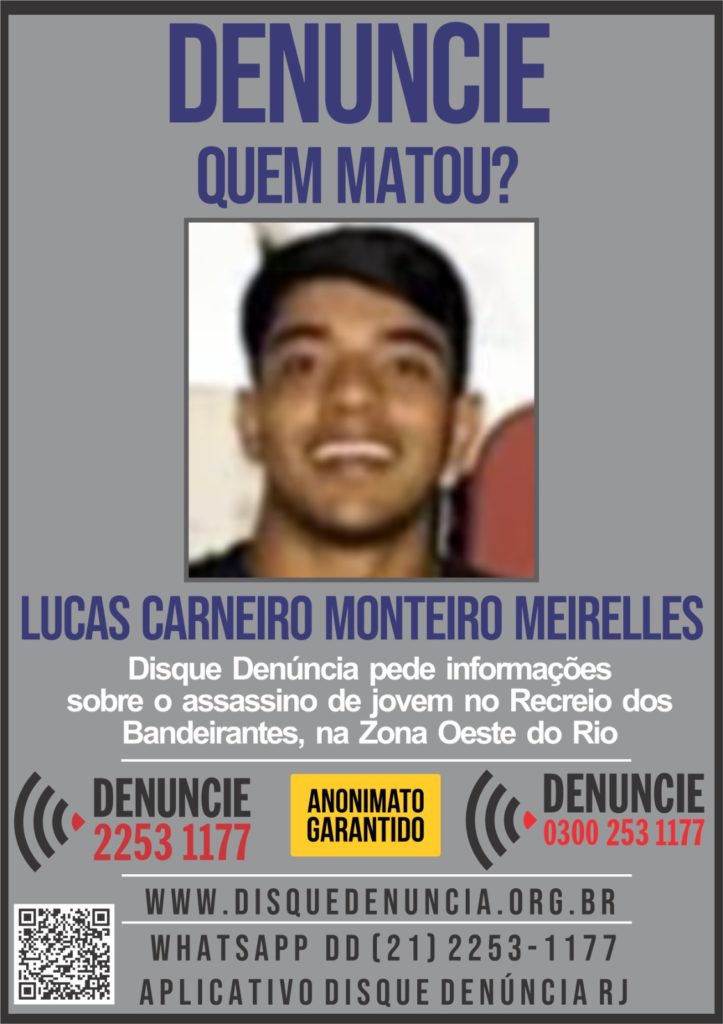 O Disque Denúncia divulgou nesta sexta-feira (16), um cartaz a fim de obter informações que levem a identificação do assaltante que matou o estudante de odontologia Lucas Carneiro Monteiro Meirelles, de 27 anos, na última terça-feira (13), no Recreio dos Bandeirantes, Zona Oeste do Rio.