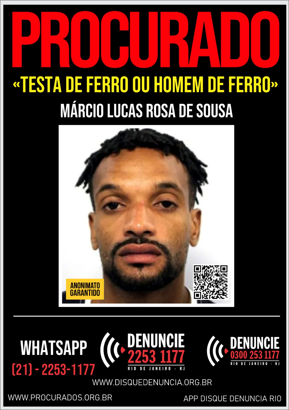 O Disque Denúncia divulgou nesta terça-feira (07), um cartaz que visa ajudar nas investigações da Delegacia de Homicídios da Baixada Fluminense (DHBF) para localizar o traficante Márcio Lucas Rosa de Sousa, de 31 anos, conhecido pelos apelidos de “Testa de Ferro”. Ele é apontado como responsável pelo homicídio de Kauan Galdino Florêncio Pereira, de 19 anos, ocorrido na madrugada do dia 1º de janeiro, durante uma festa no Morro São Simão, em Queimados, na Baixada Fluminense.