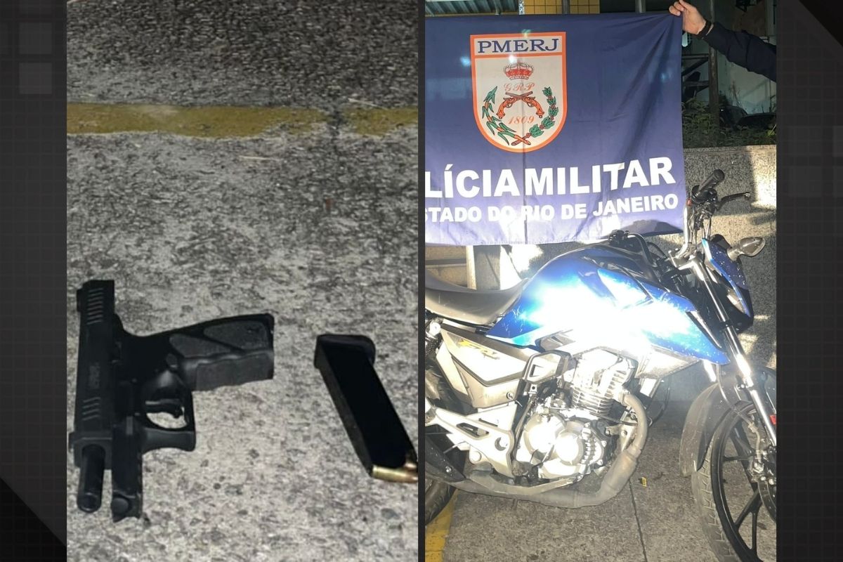 Na ação, os agentes apreenderam uma pistola e uma motocicleta; um dos criminosos tinha um mandado de prisão em abertoPoliciais militares do 20° BPM (Mesquita) trocaram tiros com criminosos na rua Alexandrina, na região do Az de Ouro, em Nilópolis, na Baixada Fluminense.