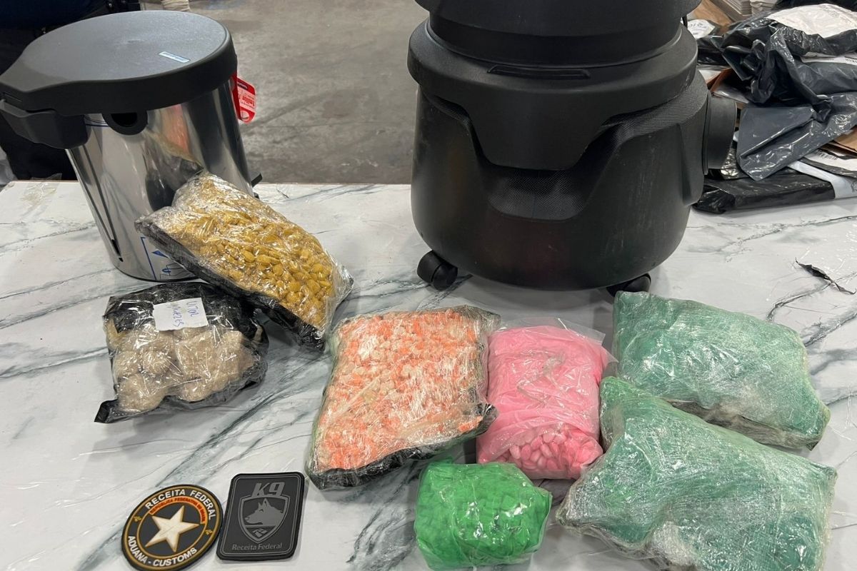 Encomendas com drogas seriam enviadas para o RS e o Pará; operação contou com apoio de cães farejadoresA Receita Federal apreendeu R$ 535 mil em drogas nesta segunda-feira (15), durante uma operação em uma transportadora em São João de Meriti, na Baixada Fluminense. A ação resultou na interceptação de duas encomendas contendo cerca de 6.400 comprimidos de ecstasy (3,35 kg) e 600 gramas de pedras de crack, ocultos dentro de um aspirador de pó e uma lixeira.