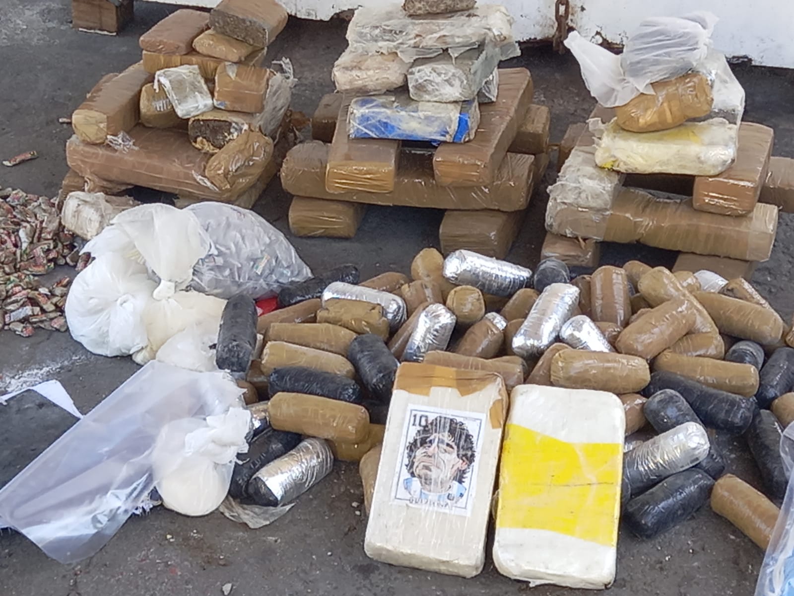 Policiais militares do batalhão de ações com cães apreenderam, na manhã desta terça-feira (16), no fundo falso de uma casa na comunidade de Manguinhos, pasta base de cocaína personalizada com a foto do ex-jogador Maradona, tabletes de cocaína, crack e maconha.