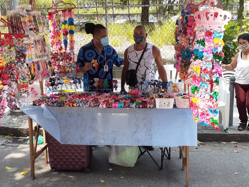“No primeiro dia da volta da feira, articulamos 20 vagas, que dividimos entre 10 empreendedores comunitários da Secretaria Municipal de Assistência Social e Direitos Humanos, cinco afroempreendedores e cinco de uma cooperativa de Campo Grande, na Zona Oeste”, explica Edu Nascimento.