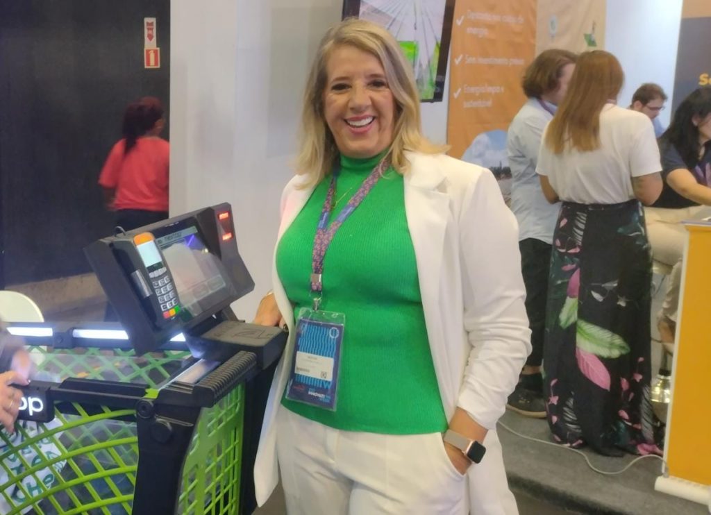Com esse carrinho inteligente, o cliente pega o produto e registra o código de barras no leitor que fica acoplado no próprio carrinho.