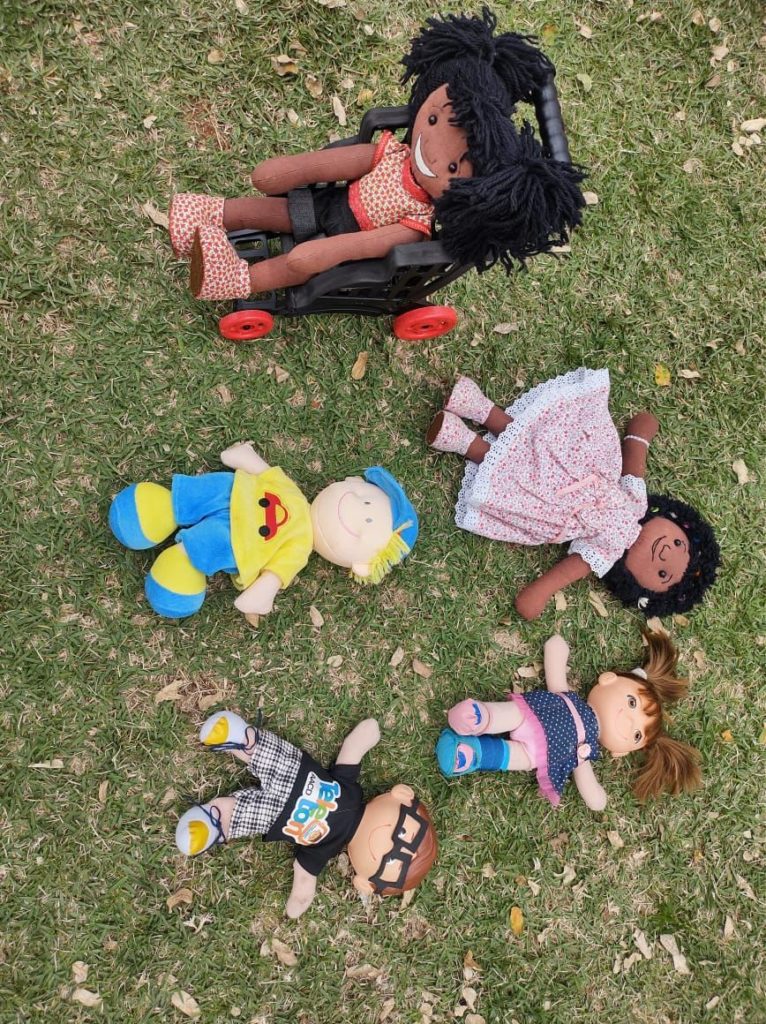 Diego que é um menino com deficiência auditiva e se comunica pela LIBRAS; Ana que é uma menina com deficiência física devido a um acidente e usa cadeira de rodas; Flor com deficiência física na perna, devido a uma má formação e utiliza uma prótese ortopédica; Beto com baixa visão e utiliza óculos e faz uso do sistema Braile; e Lulu que é uma criança com Transtorno do Espectro Autista (TEA). Depois de ganharem corpo na forma de brinquedo, os personagens ganham uma história em um “livrão”, que serve como matriz para livretos que são levados para casa, com os cadernos de registro, em sacolas decoradas.
