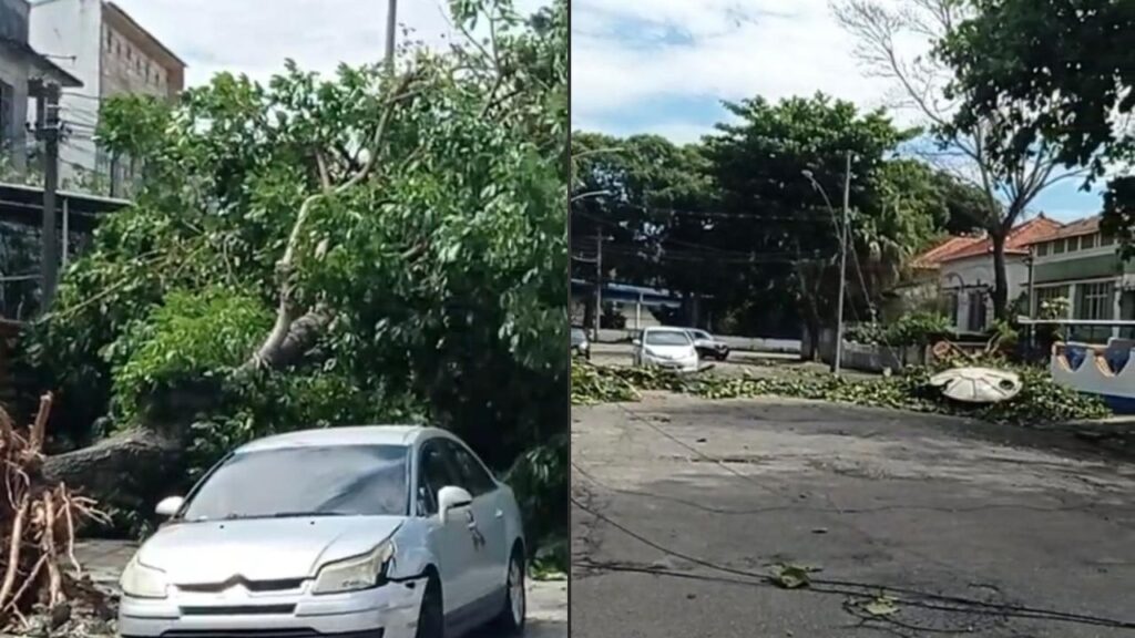 Uma figueira com mais de 20 metros de altura caiu durante o temporal desta sexta-feira (3), no bairro da Glória, na Zona Sul do Rio de Janeiro, e atingiu dois carros.