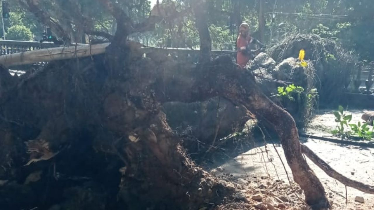 Figueira de 20 metros cai, destrói carros e deixa motorista preso na Zona Sul