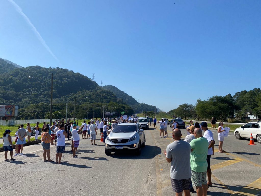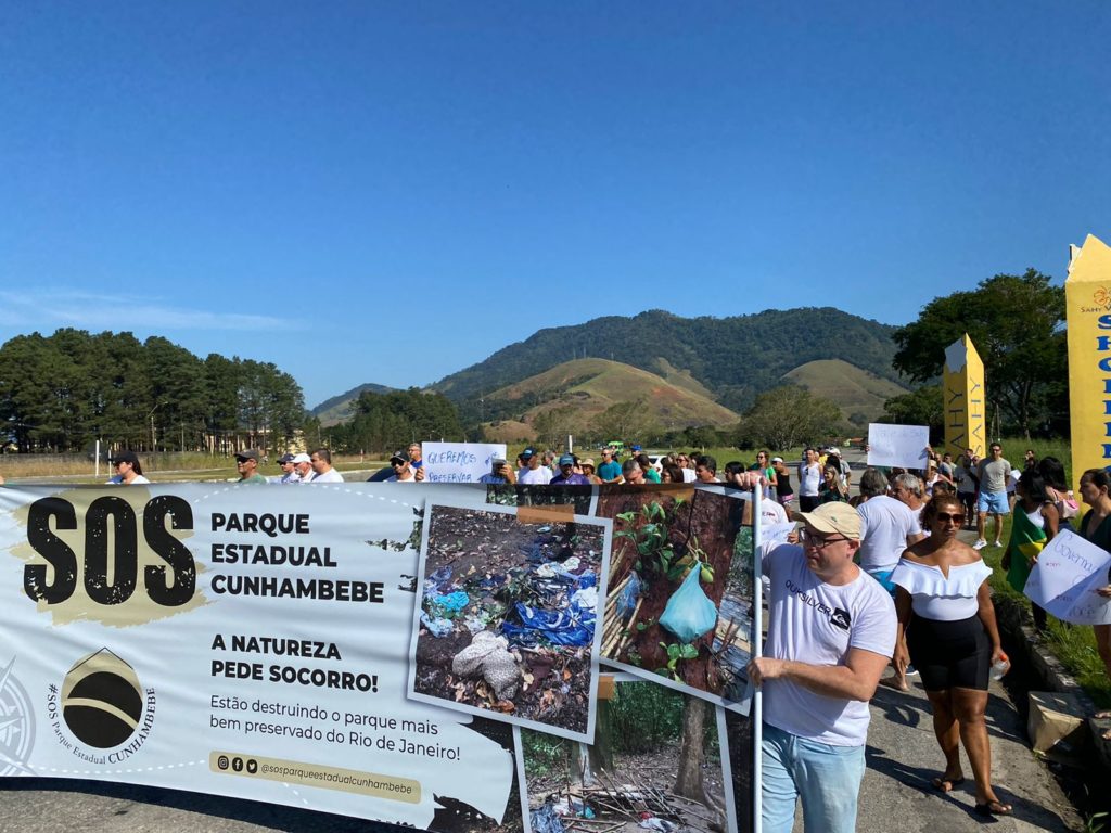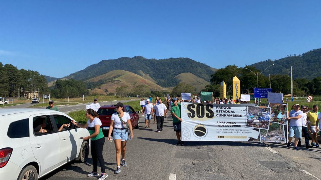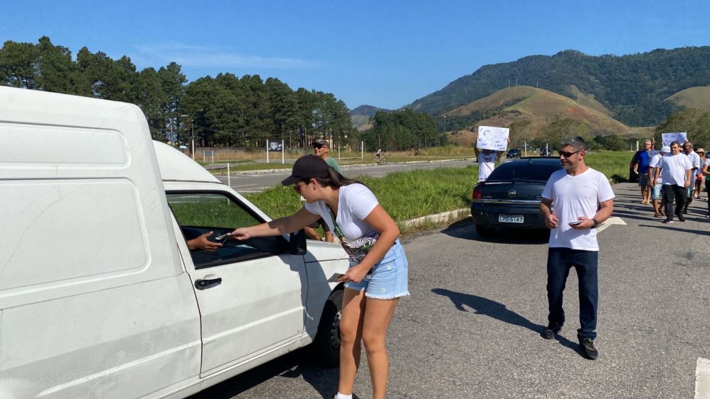 Os manifestantes distribuem panfletos para informar sobre a invasão irregular de pelo menos 100 pessoas em uma área ambiental do Parque Estadual do Cunhambebe.
