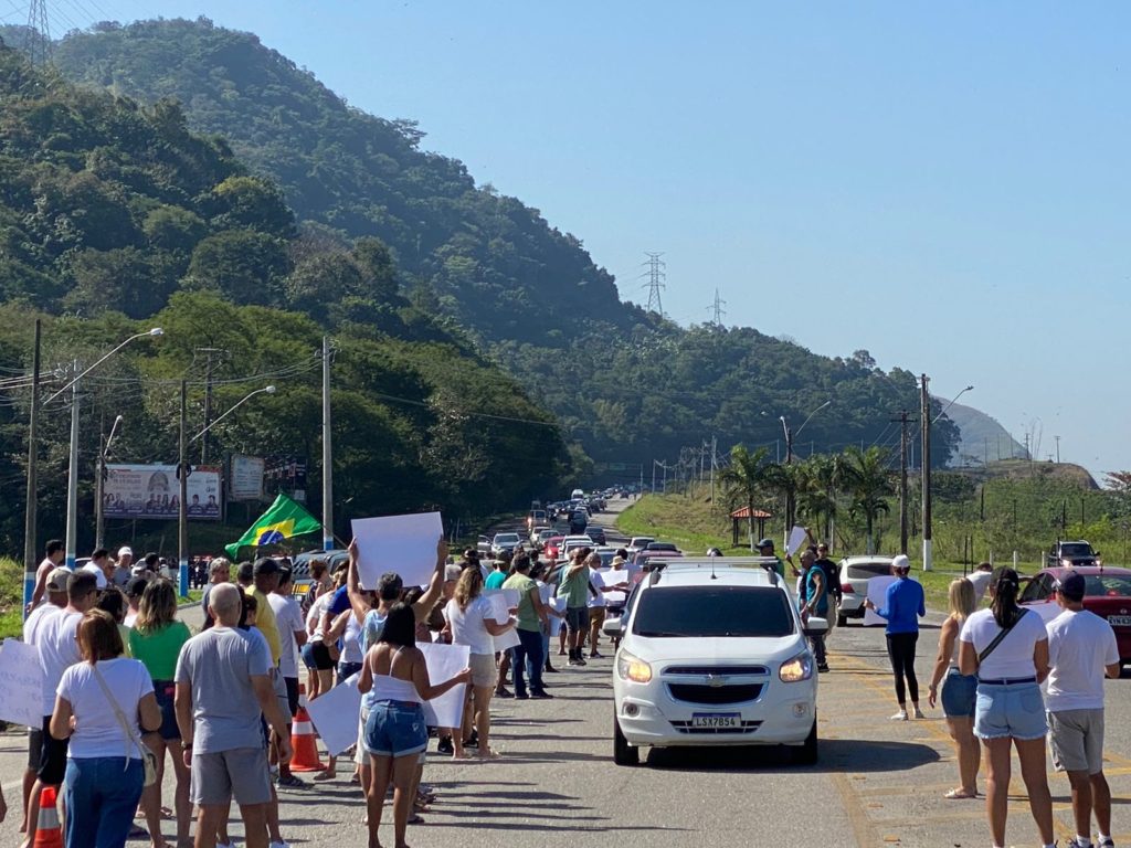 Cerca de 50 pessoas realizam uma manifestação na BR 101 Sul, a Rodovia Rio Santos, na altura de Mangaratiba, na Costa Verde Fluminense, na manhã deste sábado (23). A situação provocou a interdição de duas faixas da via. O trânsito apresenta retenção no trecho, na pista sentido Angra dos Reis.