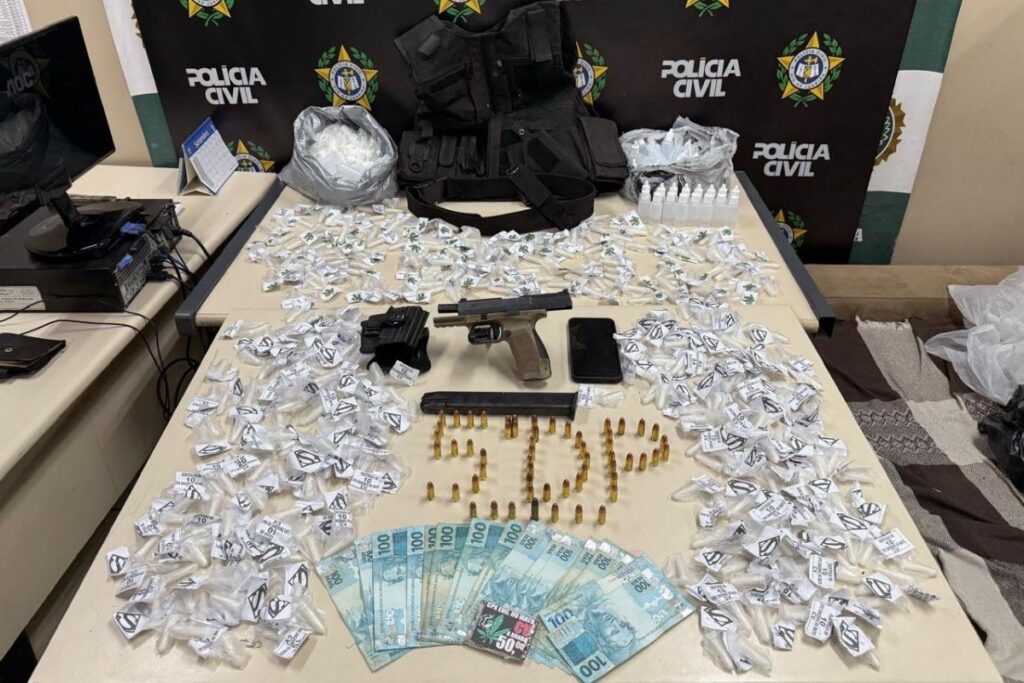 Foram encontrados com o criminoso, uma pistola, carregadores, colete balístico, mais de quinhentos pinos de cocaína, cento e catorze frascos de óleo de skank.