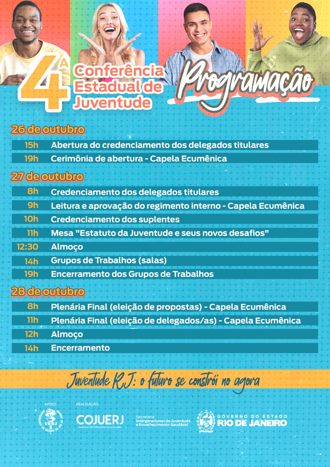 Após um hiato de oito anos sem realização, a Conferência Estadual de Juventude está de volta. O Governo do Estado, por meio da Secretaria de Estado de Juventude e Envelhecimento Saudável (Seijes), e o Conselho Estadual da Juventude (Cojuerj), realizam a 4ª edição do evento com o tema “Juventude RJ: o futuro se constrói no agora”. A conferência acontece de 26 a 28 de outubro, na Universidade do Estado do Rio de Janeiro (Uerj).