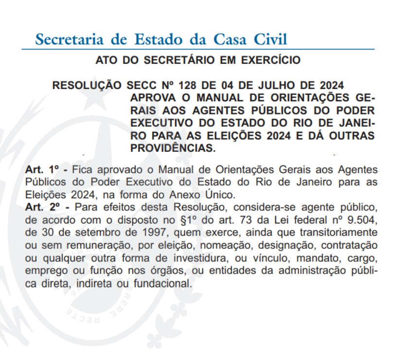 A Secretaria de Estado da Casa Civil, órgão vinculado ao Governo do Estado do Rio, publicou nesta sexta-feira (5), um manual com orientações gerais de servidores públicos do Poder Executivo para as eleições municipais deste ano. Segundo a Pasta, o documento tem o objetivo de orientar os agentes públicos sobre a participação no pleito eleitoral.