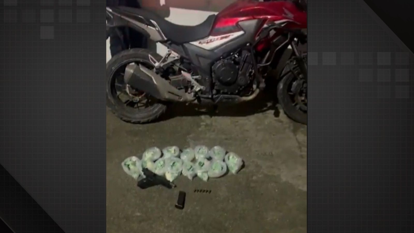 Durante a ação, os policiais apreenderam uma pistola, munições, uma grande quantidade de drogas e a motocicleta usada pelo suspeito. A identidade do homem não foi divulgada.
