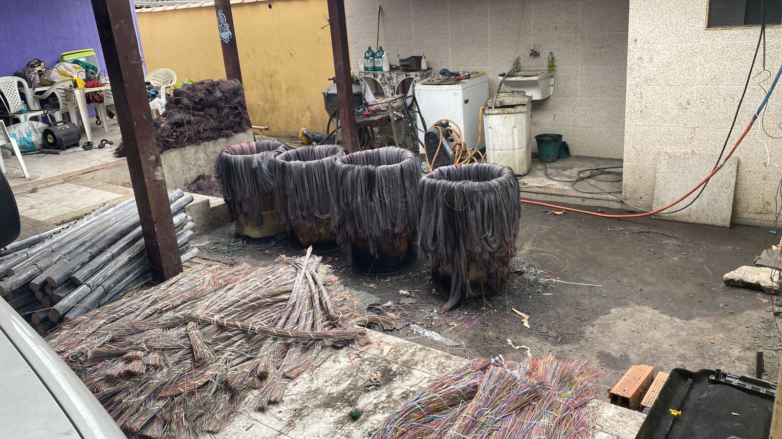 No local, os policiais encontraram cabos de cobre já cortados e uma quantidade separada que estava sendo queimada.