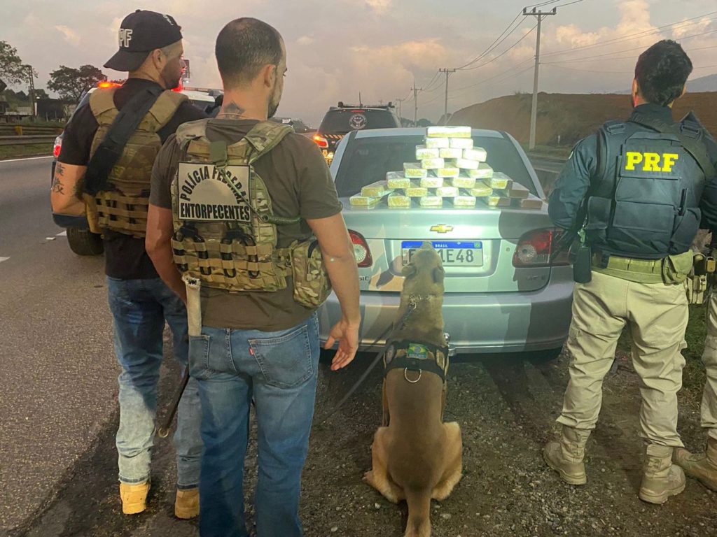 A abordagem ao veículo, realizada por agentes da Polícia Federal e da Polícia Rodoviária Federal, aconteceu na altura de Queimados. As drogas estavam escondidas no porta-malas.