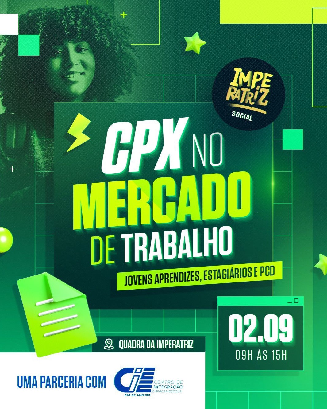 A Imperatriz Leopoldinense promove, neste sábado (2), em parceria com o Centro de Integração Empresa Escola (CIEE), uma ação social para inserir jovens moradores do Complexo do Alemão e adjacências ao mercado de trabalho. As vagas serão oferecidas a adolescentes a partir de 14 anos. Há ainda a oferta de emprego CLT para pessoas com deficiência (PCD), sem limite de idade.