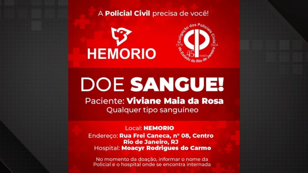 Viviane Maia da Rosa está em estado gravíssimo após ser atingida por tiros do namorado policialA inspetora Viviane Maia da Rosa, de 33 anos, baleada pelo namorado, o policial civil Vinicius Silva de Souza, segue internada em estado gravíssimo no Hospital Moacyr do Carmo. Após passar por cirurgia, ela precisa de doações de sangue, que podem ser feitas no Hemorio, no Centro do Rio. Doadores devem informar o nome da inspetora no momento da doação.