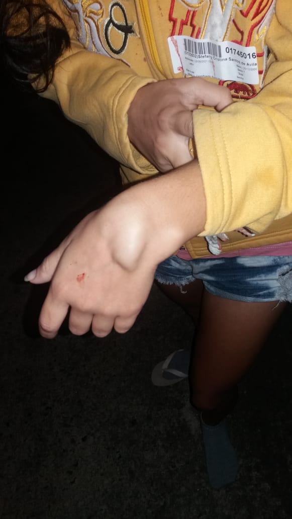 A vendedora relatou ainda que durante uma discussão com um dos seguranças, caiu e, por causa da queda, quebrou o braço e dois dentes. Logo em seguida, um policial militar foi chamado pelo pai da jovem.