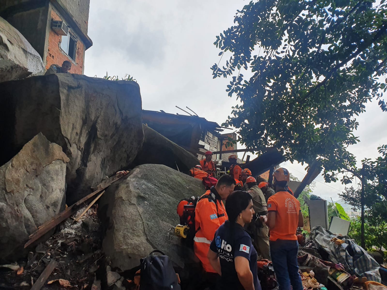 O Corpo de Bombeiros tenta resgatar um jovem, identificado apenas como Lucas, de 18 anos, que está ferido na perna após uma pedra se soltar e atingir a casa onde ele mora no Morro do Quieto, na Avenida Marechal Rondon, altura do nº 2263, no bairro do Sampaio, na Zona Norte do Rio de Janeiro.