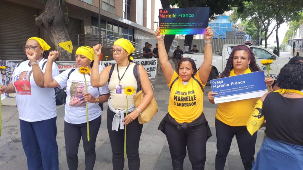 Girassóis, símbolo da memória da parlamentar assassinada em 14 de março de 2018, no Estácio, foram distribuídos aos participantes. Parentes do motorista Anderson Gomes também marcaram presença