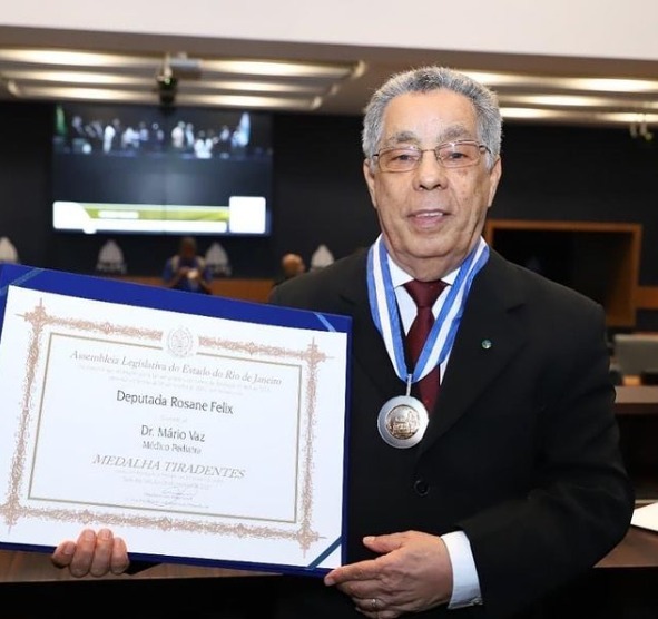 O pediatra Mario Vaz, de 80 anos, baleado no tiroteio ocorrido na tarde deste domingo (24) na Avenida Brasil foi condecorado com a Medalha Tiradentes, a mais alta honraria do estado do Rio, em março do ano passado.